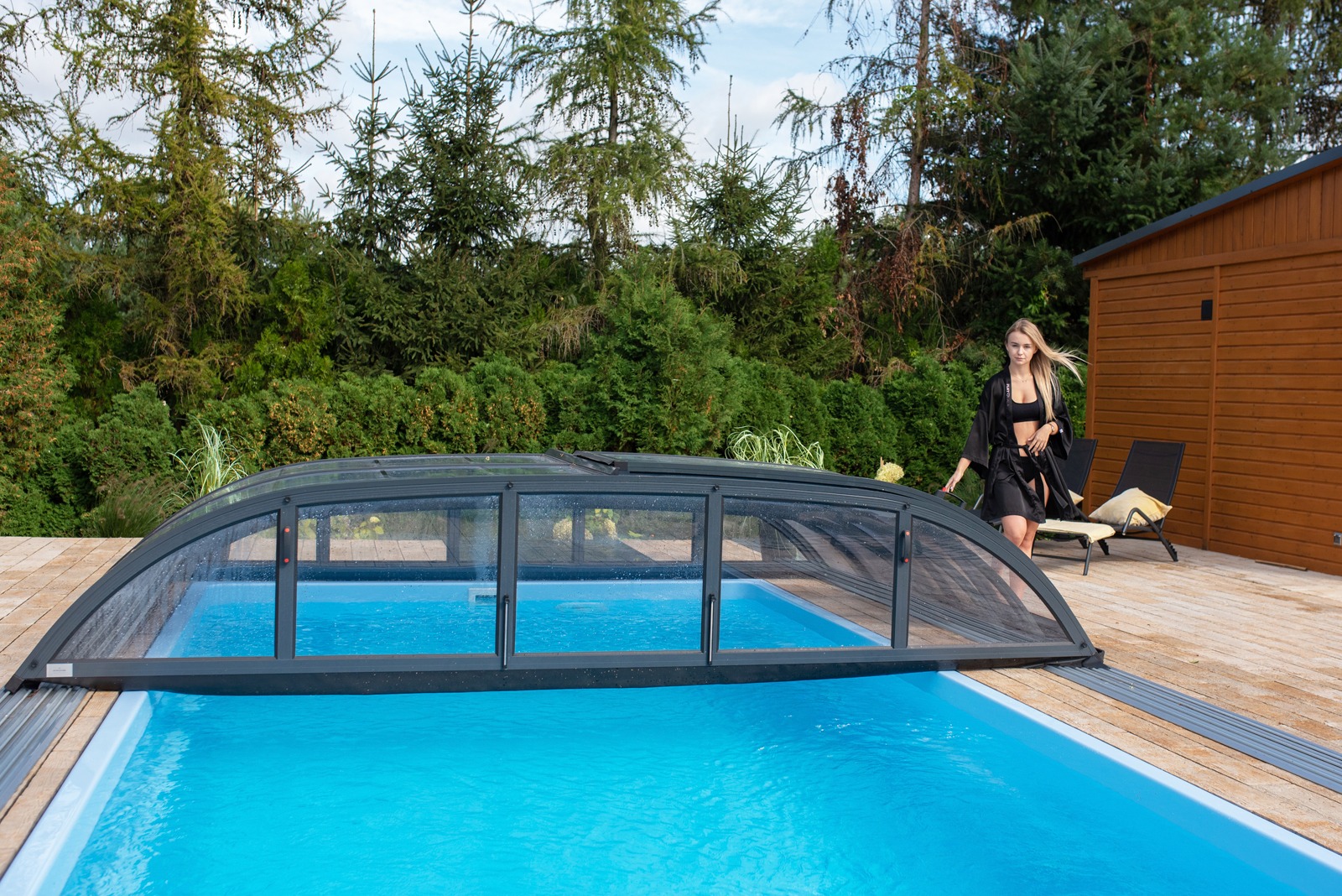 ELEGANT is a very popular enclosure and one of the most frequently chosen by our customers. It is characterized by high functionality – it does not disrupt the harmony of the surroundings, it is not too tall, yet it still allows the pool to be used even when the segments are closed.