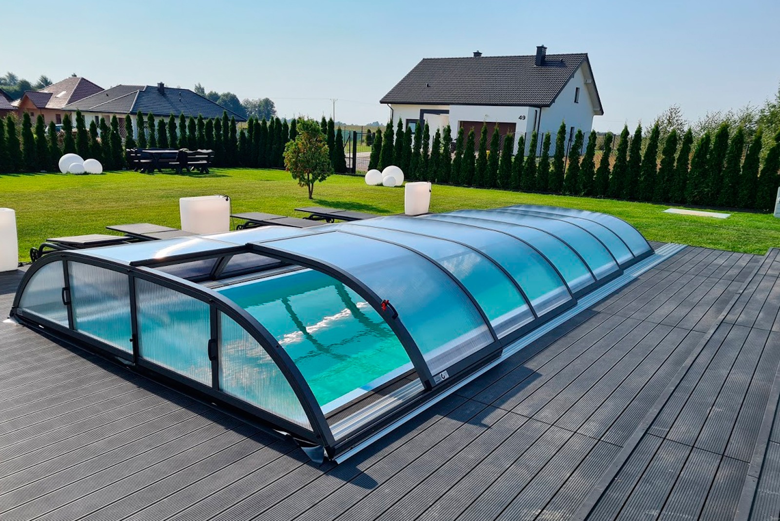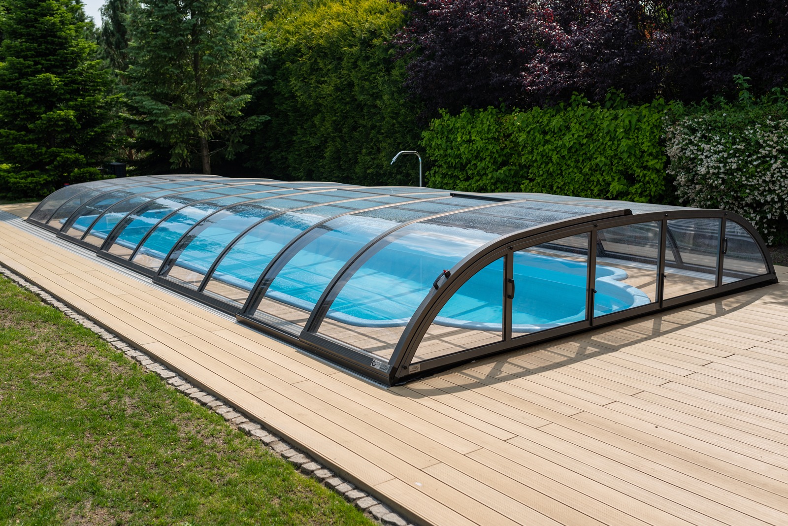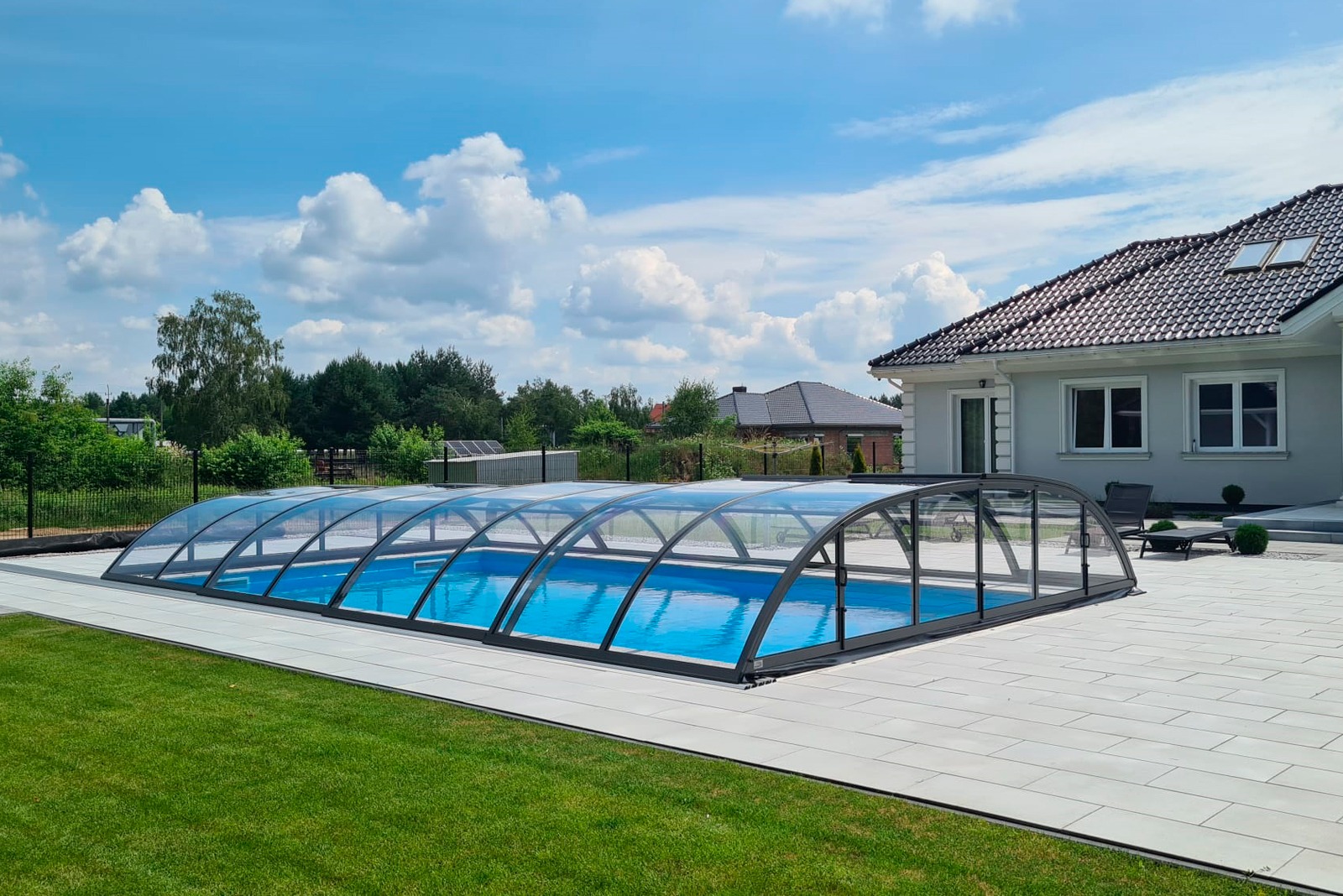 Low-profile pool enclosure with an arched shape and sliding doors.